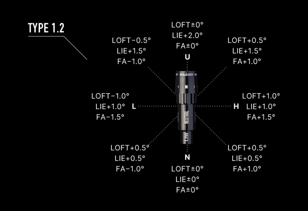 ロフト角はヘッドのロフト角を基準にTYPE1.2は±1.0度の範囲で8通りのポジションから選択が可能です。各ポジションでロフト角、ライ角、F.Aについて下記をご覧ください。